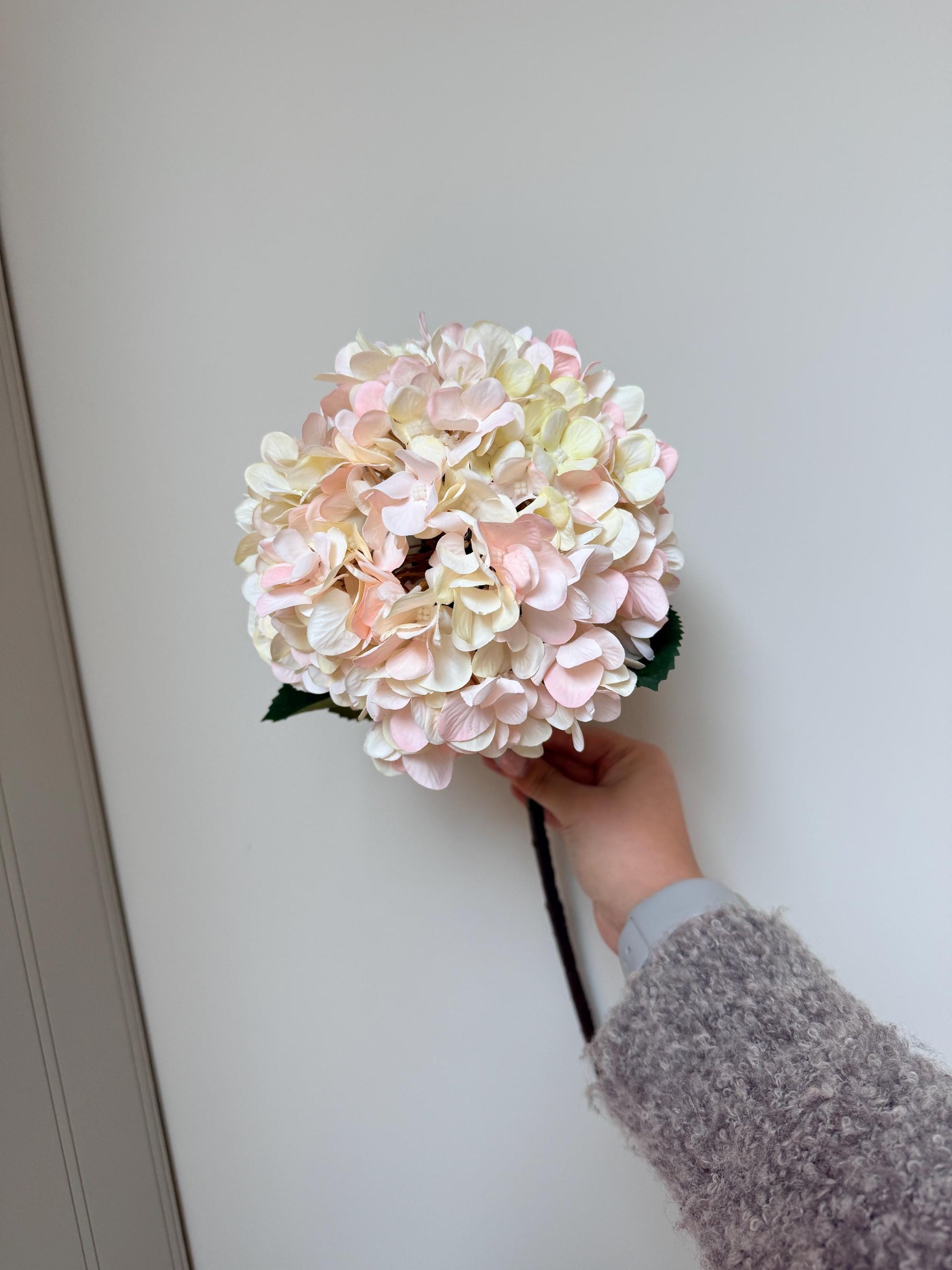 Add a touch of elegance to any space with these luxurious blush pink and white faux hydrangea stems.