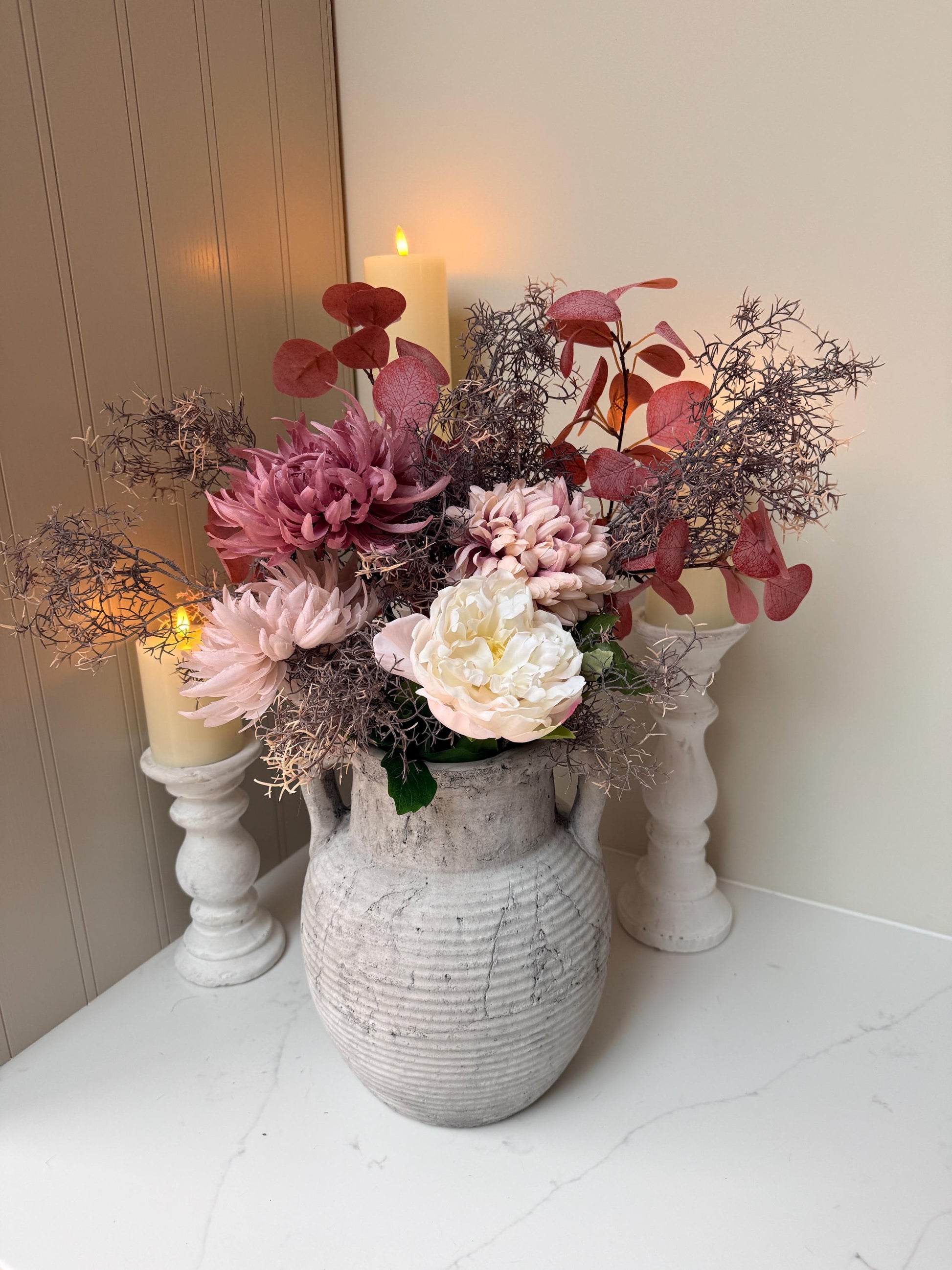 With lush dusky pink stems, soft peony roses, and textured greenery, this display feels full and natural, adding instant elegance without the upkeep of fresh flowers.