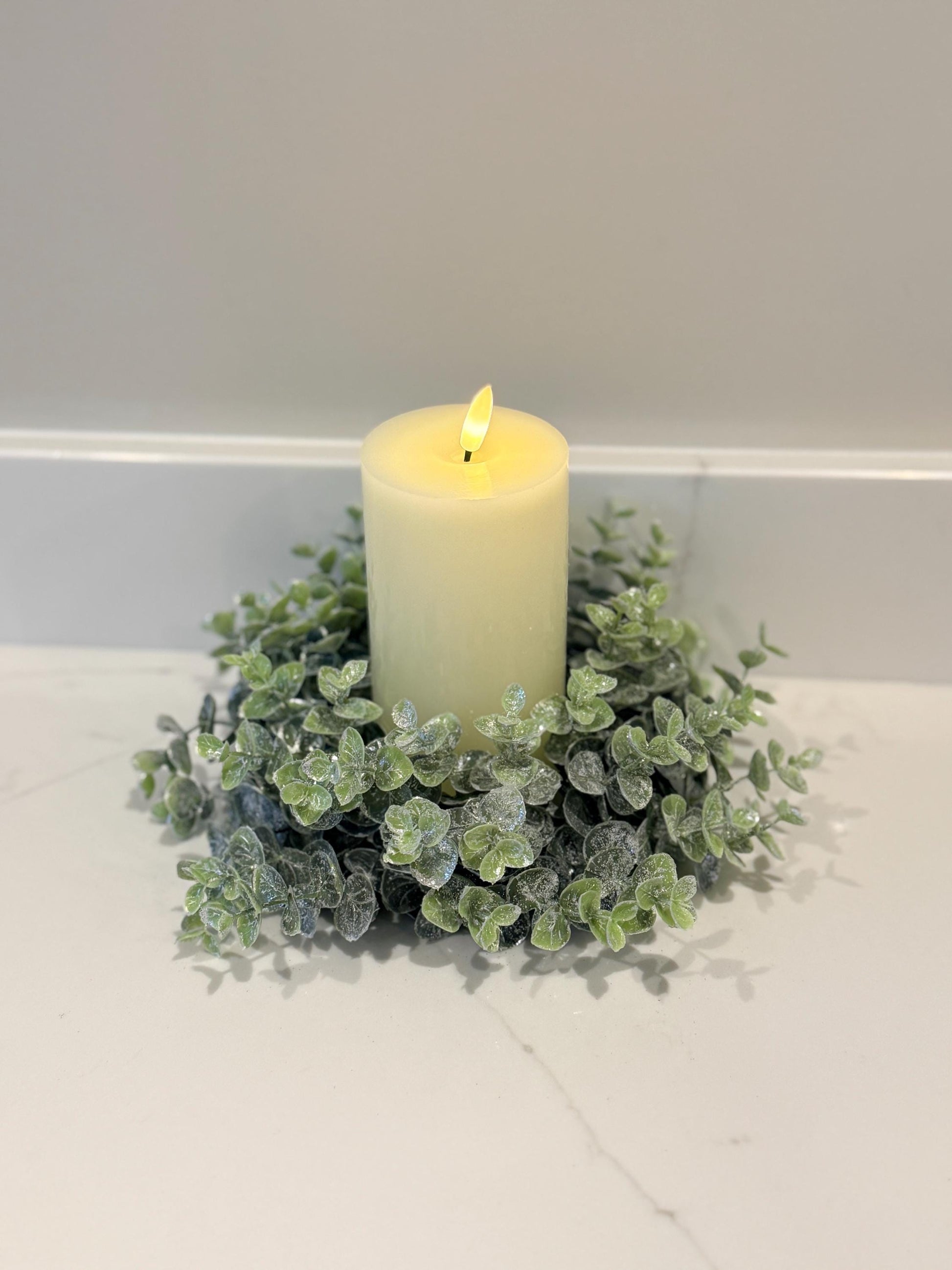 Designed with realistic frosted eucalyptus leaves, this greenery candle ring is perfect for styling around pillar candles, lanterns, vases, or as part of a beautiful table centrepiece.