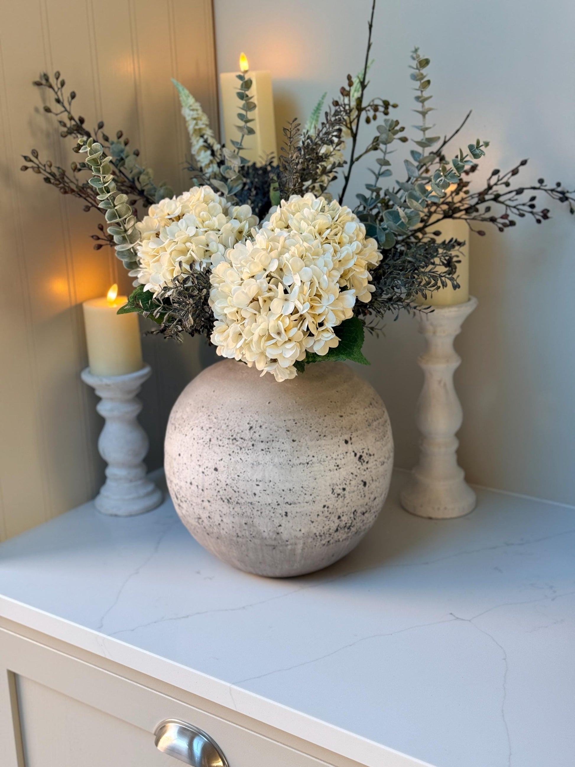 Bring timeless elegance into your home with our “Gracie” Faux Flower Arrangement – a beautifully hand-crafted display featuring soft cream hydrangeas, delicate eucalyptus stems, and textured foliage for a natural, luxury look.