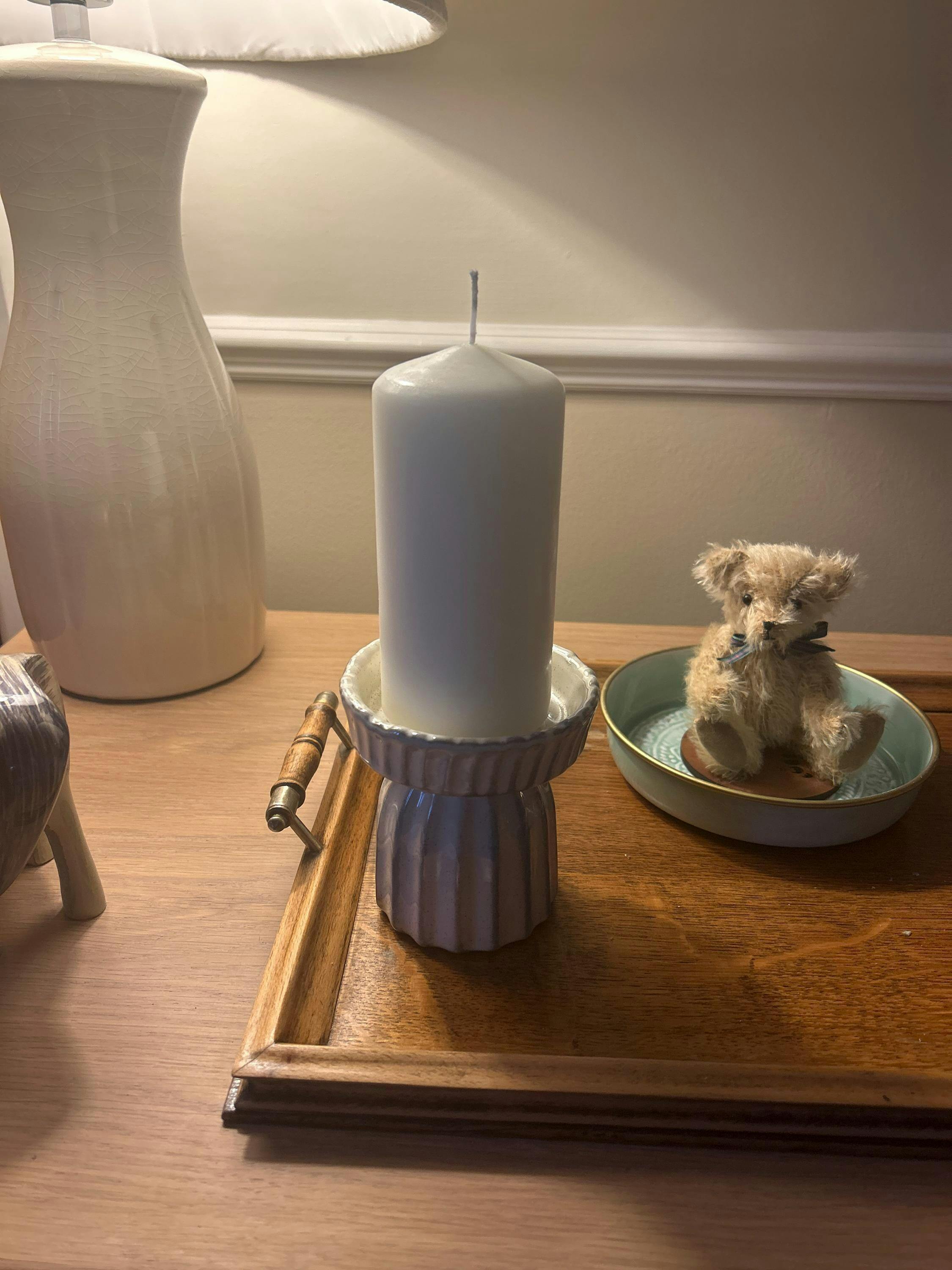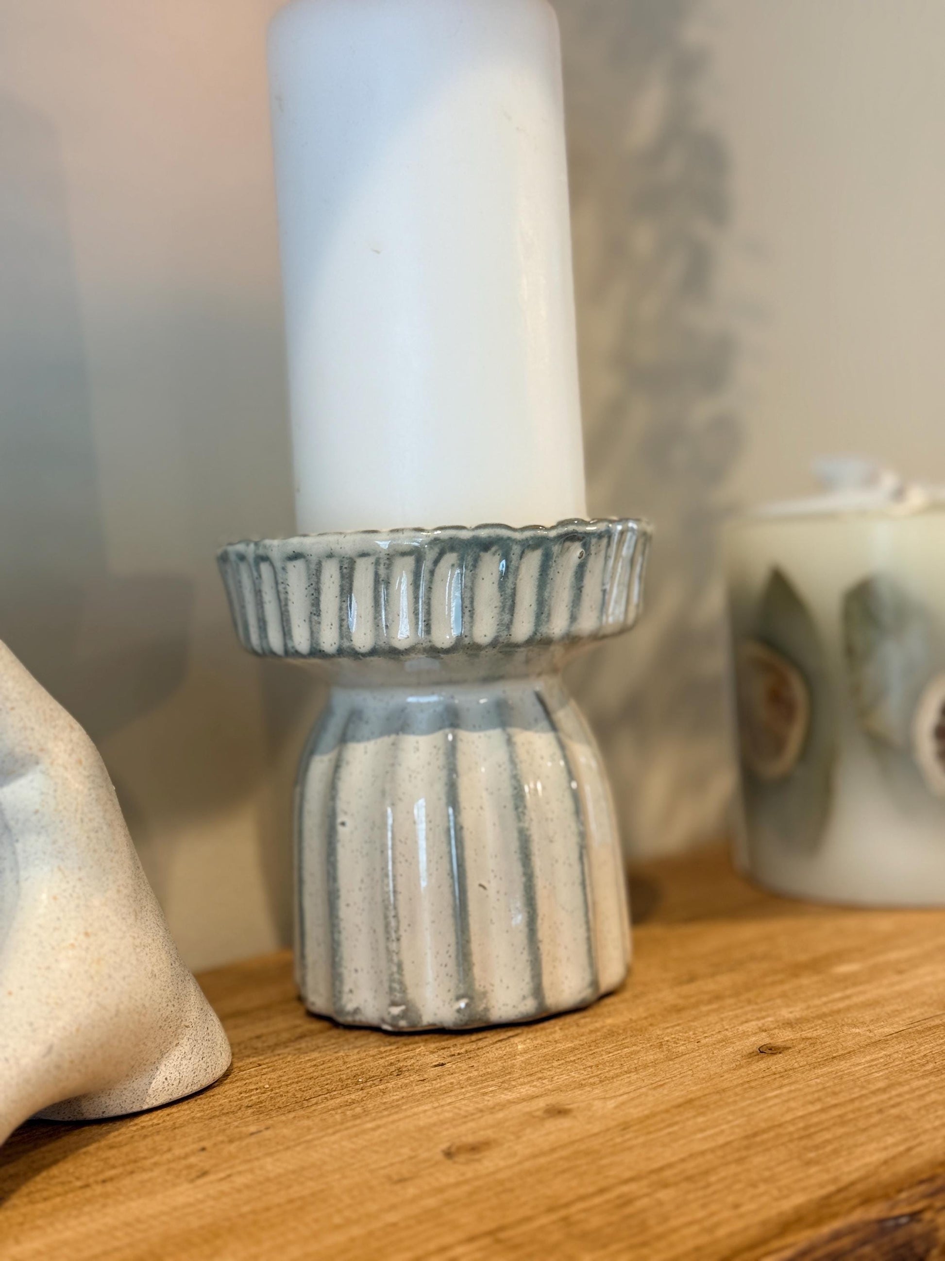 Handcrafted Neutral Ceramic Ribbed Beige Pillar Candle Stick Holder Stand