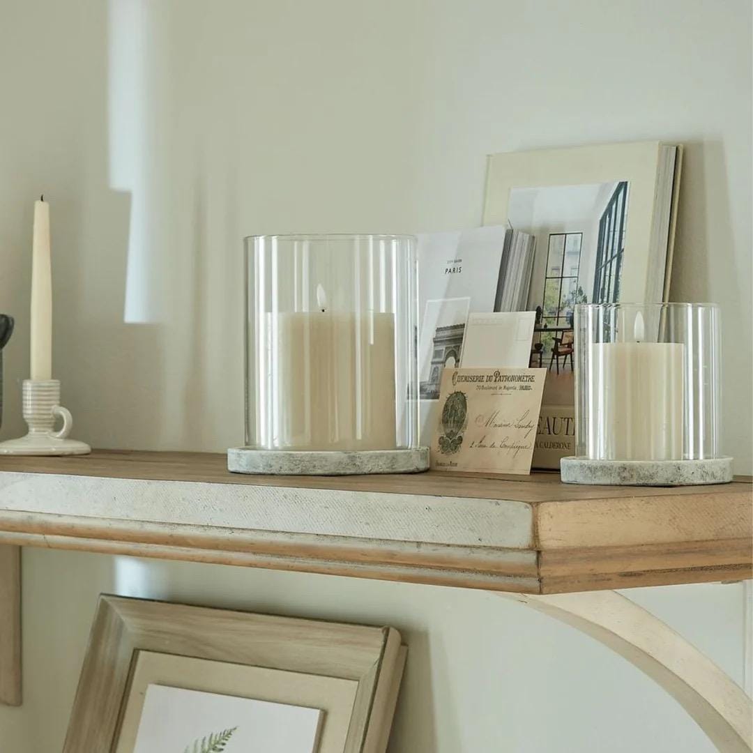 This elegant glass hurricane candle holder with a textured stone-effect base is the perfect way to style candles in your home.